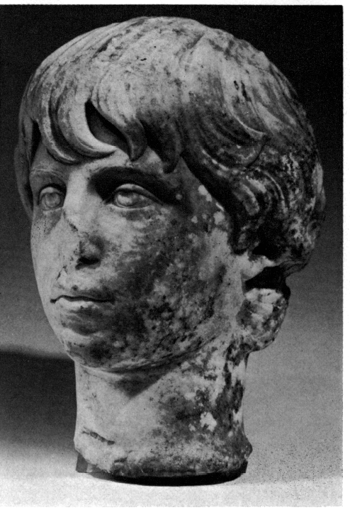 Parmi les trouvailles de la campagne nous illustrons une tête de Polydeukès grandeur nature (fig. 70) trouvée au Sud de la pièce XI dans la couche de destruction du corridor de chauffe.