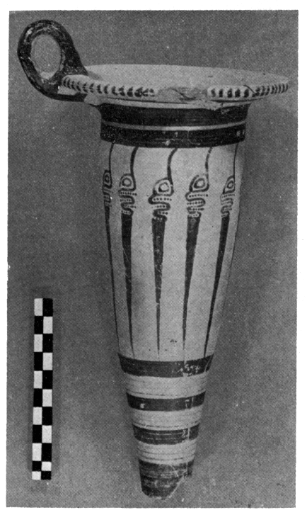 Entre la muraille et le bâtiment 6, l'horizon HR III Β 2, scellé par la couche de destruction du mur Ouest du bâtiment, s'est révélé particulièrement riche en céramique. On signale notamment une amphore de style « nordique » (fig. 76) retrouvée près du foyer domestique du dernier état. Sous le sol de l'état précédent est apparue la tranchée de fondation du rempart, large d'environ 2 m et profonde de 1,70 m. Elle recelait, dans les dépôts en place, de la céramique HR III Β 2 (fig. 78) qui permet d'assigner définitivement à cette phase la construction du mur d'enceinte. A noter, parmi les trouvailles non céramiques, un fragment d'os de lion appartenant à la plus ancienne espèce connue en Grèce. Le dégagement de la tranchée a également livré plusieurs squelettes, ensevelis sans offrandes avant la fin du HR III Β 2. Cette découverte porte à plus de quarante le nombre d'inhumations de ce type dans la citadelle basse : K. Kilian retient l'hypothèse de sépultures d'esclaves affectés soit à la construction de la citadelle soit à des tâches domestiques dans les bâtiments où elles sont groupées.