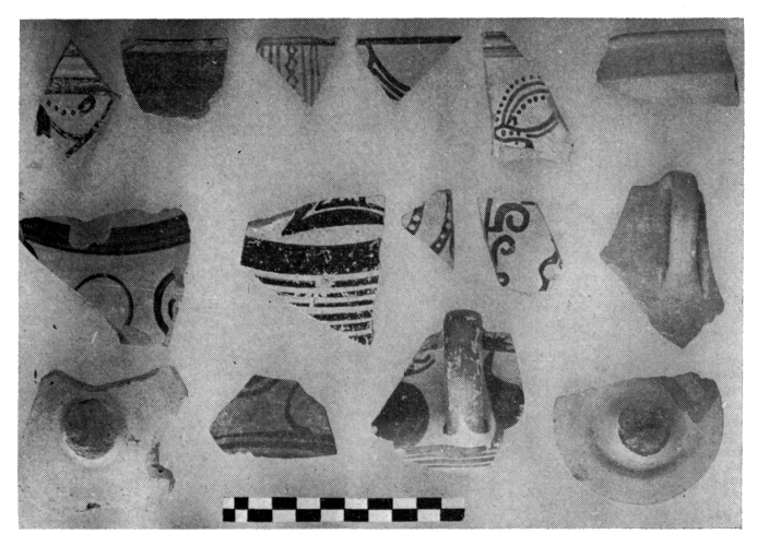1) Dans la couche post-mycénienne, dont l'épaisseur atteint 2,50 m en LXII/45, on a trouvé, parmi un matériel mêlé (géométrique, slave, byzantin, moderne), un fragment de tablette portant une inscription en Linéaire Β relative à des produits divers dont de l'alun (fig. 79). Au-dessous on a poursuivi le dégagement du niveau HR III C, recueillant un grand nombre de vases — dont un grand cratère (fig. 75) et plusieurs tasses à anse surmontée d'une protome de taureau — des boutons en stéatite et des idoles en Ψ. A l'issue de cette campagne le dernier niveau d'habitat mycénien est mis à nu dans toute la moitié Ouest de la citadelle basse (fig. 74).