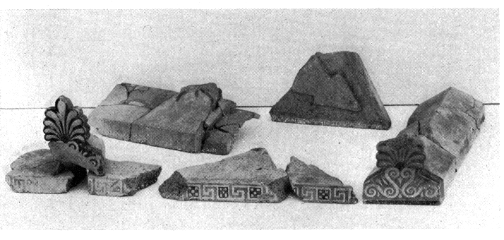 A l'Est de cette zone sont apparus des tronçons de murs tardifs ; à l'Ouest les fondations d'un bâtiment de 20 x 15 m que sa disposition intérieure (quatre murs concentriques et trois murs rayonnants) désigne comme une salle de spectacles, ou mieux un odéon, vraisemblablement en rapport avec les thermes de l'Est construits au IIe siècle ap. J.-C. Hormis quelques murs, qui devaient appartenir à une aile de la Maison de Néron et furent en partie recouverts par l'odéon, le secteur est à peu près complètement dépourvu de constructions. Les premières traces d'occupation n'y remontent pas au-delà du VIe siècle av. J.-C. Dans la première moitié du Ve siècle av. J.-C. une série d'alignements de pierres Nord/Sud (fig. 98, travées 11-12) fut mise en place en même temps qu'un remblai destiné à combler une dépression naturelle : on y a retrouvé, dans une terre cendreuse, de nombreux os, des fragments de poterie domestique, des lampes, des objets en bronze et une grande quantité de déchets de marbre provenant d'un atelier où l'on dut travailler à l'exécution des sculptures et des tuiles du temple de Zeus. Échantillon de la production annexe de cet atelier, une statuette féminine assise de 17 cm de haut, inachevée, qui conserve encore, en rouge, les traces de l'esquisse. De ce remblai on a également retiré une série de tuiles fragmentaires en terre cuite — certaines en forme de losange — et de kalyptères à antéfixe désaxée que A. Mallwitz attribue à un toit de type « Schrägdach » (fig. 96).