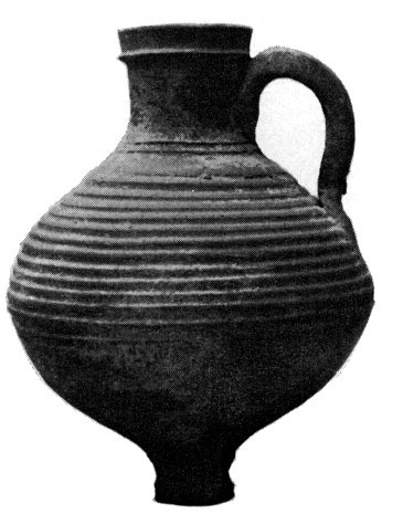 A l'extrémité Sud de l'aile orientale quelques pièces conservaient encore, outre leur sol, plusieurs assises de briques crues en place sur le soubassement des murs, ce qui a permis de nouvelles observations d'ordre architectural et chronologique. On a pu relever dans toute la partie Sud-Est des traces de réparations et de remaniements effectués dès avant l'achèvement des travaux, peut-être à la suite d'un tremblement de terre. Le « palais », dont le dernier état n'est pas antérieur au premier quart du IIe siècle av. J.-C., semble avoir été abandonné dès la fin de la domination macédonienne sur la Magnésie : les tessons du Ier siècle av. J.-C. y sont très rares. En revanche on note, parmi les masses de briques crues et le remblai des fondations, la présence de matériel pré-hellénistique — céramique du Géométrique Récent, tessons et monnaie archaïques — qui doivent provenir des décombres d'un site voisin. Au IVe siècle ap. J.-C. l'espace fut réutilisé par une nécropole dont on a fouillé une cinquantaine de tombes. Certaines étaient dépourvues de mobilier, les autres contenaient de la céramique (fig. 130), quelques bijoux et des monnaies (de Constantin + Crispus à Valentinien Ier). On signale aussi, immédiatement au Nord de la tour Sud-Est, un bâtiment carré dont on ne peut déterminer avec certitude la nature ni la date, mais qui pourrait bien être un édifice cultuel en rapport avec la nécropole.