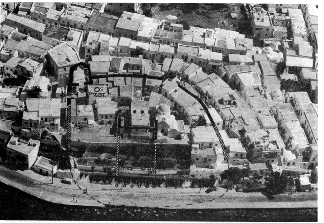 Par un relevé topographique de l'état actuel et de l'état antique de la citadelle on a pu retracer l'évolution du site depuis l'acropole primitive jusqu'à la ville du XVIIe siècle en passant par la forteresse vénitienne. A une époque assez récente, l'érosion marine a entamé la bordure Est de la colline qu'elle a fait reculer d'au moins trente mètres vers l'intérieur, emportant la façade et l'autel du temple A ainsi que le mur Est de la forteresse vénitienne (fig. 163). Le temple A, qui doit être restitué amphiprostyle à six colonnes, n'avait certainement pas de colonnade extérieure. L'emplacement des temples B et C n'a toujours pas pu être déterminé. L'enceinte et l'entrée de l'acropole antique doivent correspondre à celles de la forteresse vénitienne, qui a visiblement tiré profit de l'implantation existante : l'accès a été localisé à l'Est de la tour Sud. Au Sud de la même tour on a découvert une vaste citerne en parfait état.