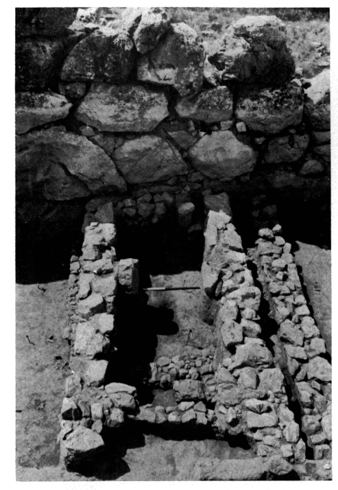 2) Dans la cour et les bâtiments adjacents (LXI/40-41) la fouille s'est enfoncée de 0,50 m, jusqu'à l'avant- dernier niveau d'occupation mycénien. Le schéma d'implantation est le même que pendant la phase finale : une cour centrale bordée par un ensemble de constructions. Dans le sol de la cour on a découvert, au Nord du sanctuaire, parmi des dépôts cendreux, deux fondations (d'autels ?) et, au Sud, deux grandes fosses bourrées de céramique HR III C 1. On signale encore dans ce secteur les traces d'une inhumation et une série de trous de poteaux qui ne permettent pas de reconstituer un plan. La limite Sud de la cour n'a pas été dégagée. La bordure Est était constituée par un bâtiment que les aménagements ultérieurs ont presque entièrement détruit. On n'en a retrouvé que le mur occidental, effondré sur les restes in situ d'une cuisine qui s'adossait à lui.