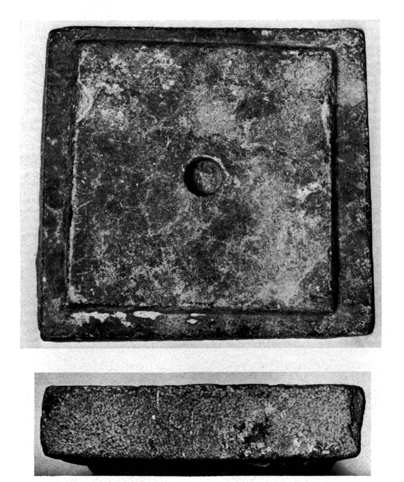 Pendant la phase précédente l'espace était aménagé différemment : au-dessous du sol de la cour, au Sud, on a en effet rencontré une vaste maison. Ses murs conservaient encore sur leur soubassement de pierre quelques assises de briques crues, tandis que de nombreux fragments de plâtre (asprochoma) ramassés sur le sol témoignent de l'existence d'un toit en terrasse (v. AJA 81 [1977], p. 229-233). Un corridor longeant la façade Est menait à un escalier coudé qui permettait d'accéder aux terrasses supérieures. C'est de cet étage que doit provenir une abaque de chapiteau en pierre retrouvée sous un amoncellement de briques crues (fig. 58-59). La maison fut détruite soudainement, mais l'état des murs et du mobilier exclut l'hypothèse d'un incendie ou d'un pillage. Le bâtiment contigu au Nord, qui n'a été que partiellement fouillé, semble lui aussi pourvu d'un escalier tournant.