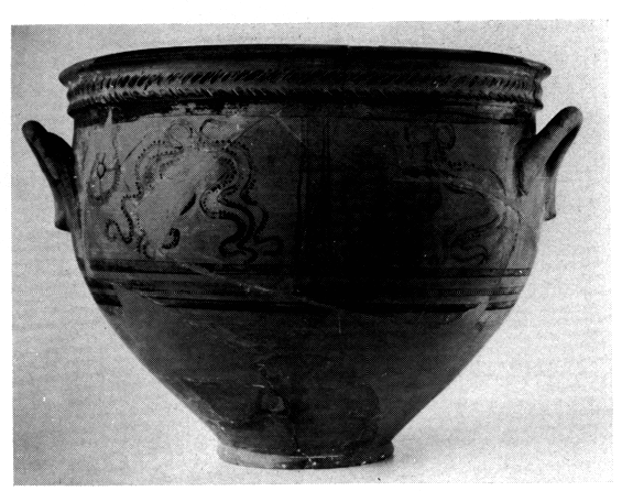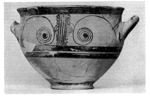 La céramique associée à l'état ancien de la cour et du sanctuaire (fig. 61) est en tout point semblable à celle de l'horizon HR III C primitif de la ville basse fouillé en 1976 (v. BCH 101 [1977], p. 549). Celle des maisons en terrasse découvertes sous la cour est beaucoup plus proche, malgré quelques différences, du matériel HR III B 2 de Mycènes (fig. 63).
