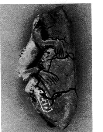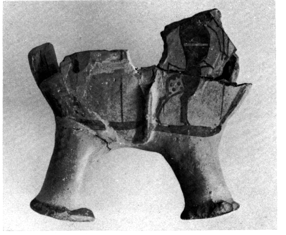 1) A l'entrée des galeries on a retrouvé le mur de soutènement qui bordait la rampe d'accès à l'Est, du côté de la colline. Directement posé sur le sol de la phase HA II, sans aucune tranchée de fondation, il s'était en partie effrondé sur la rampe. Parmi les pierres écroulées et dans le mur lui-même on a recueilli de la céramique HR III C. L'aménagement de la rampe, dont le départ était marqué par un seuil de pierre massif, amena quelques remaniements dans le bâtiment 3 (LXI/36-37). Un nettoyage a permis de découvrir, encastré dans le sol de l'une des pièces, les restes d'un troisième bassin en plomb. Sous le sol on a trouvé une figurine en faïence qui représente un singe et porte le cartouche d'Aménophis II (fig. 65). Elle est de même fabrique que celle de Mycènes publiée par Pendlebury (Aegyptiaca, p. 55 n° 85).