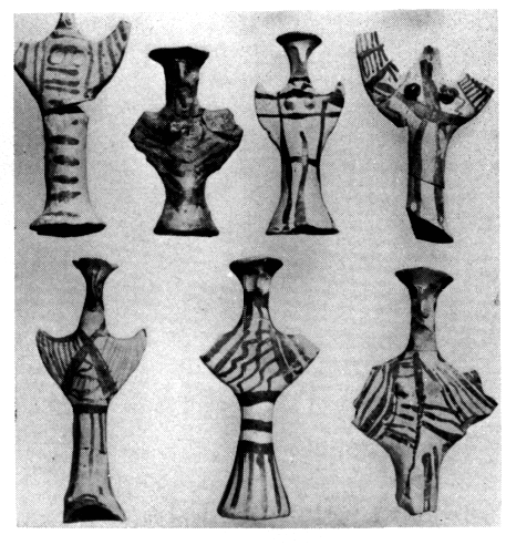 Le sol de la cour venait buter contre les murs du sanctuaire primitif, auquel se superposa exactement le suivant (fig. 57). Dans son premier état l'édifice mesure 2,70 x 2,90 m et présente déjà, comme dans le second, une ouverture à l'Est légèrement désaxée. Ses murs en brique crue reposent sur un socle de petites pierres et semblent bien avoir été recouverts à l'extérieur d'un crépi de chaux. Le sol intérieur est constitué par quatre fines couches de mortier de chaux sur un lit d'argile. Sous la couche supérieure on distingue des taches d'une peinture rouge qui dut servir à peindre les murs. Contre le rempart s'adosse une banquette en brique crue de 0,60 m de haut, percée à l'origine d'une niche centrale qui fut ensuite rebouchée. Le caractère sacré de l'édifice est confirmé par les trouvailles : des fragments de trois grandes idoles, trente figurines en Τ (fig. 64), divers petits objets et un riche matériel céramique. On retiendra surtout quatorze vases miniatures et les restes de deux rhytons en forme de taureaux, dont le décor peint représente une divinité animale en position debout (fig. 62).