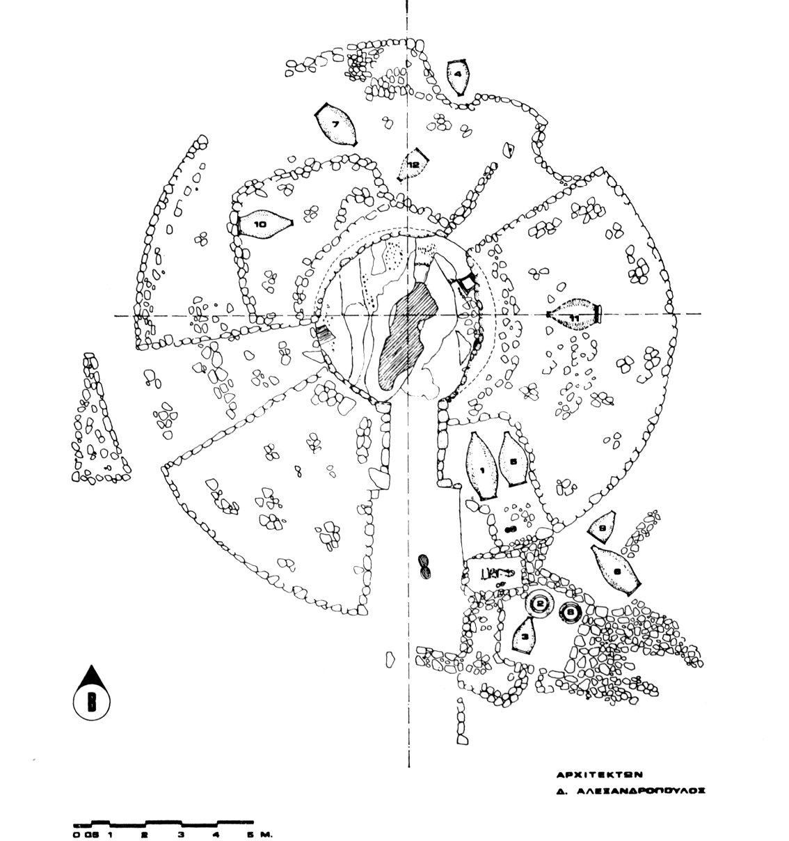 A l'intérieur de la tombe, sous le sol de l'état final, on a trouvé de l'outillage lithique HA et HM (meules, nucléus, pointes de flèches) ainsi qu'une petite idole. A l'entrée du dromos la fouille a fait apparaître une structure rectangulaire qui abritait trois pithoi (fig. 81, nos 2, 8, 3) et, juste à côté, une tombe à fosse HM. Devant celle-ci, à un niveau légèrement inférieur, un pithos HA III à décor plastique recouvrait un crâne d'animal. Au milieu du dromos, deux jarres qui contiennent des cendres et semblent renvoyer à un horizon néolithique n'ont pu encore être complètement nettoyées. A l'Est de la tombe à fosse étaient disposés deux pithoi funéraires (9 et 6) dont l'un abritait une double sépulture, tandis que sept autres (1, 4, 5, 7, 10, 11, 12 [fig. 80]) se répartissent autour de la tholos, à l'intérieur d'un tumulus en pierres légèrement ellipsoïdal (diamètre : 13,70x15,20 m). D'autres pithoi ont pu être détruits par le fossé Nord-Est/Ouest qui coupa le tumulus vraisemblablement à l'époque hellénistique. On notera que les neuf pithoi existants ont l'embouchure tournée vers l'extérieur du cercle. Un premier élément de datation, qui devra être confirmé et précisé par l'examen de l'ensemble du matériel, est fourni par un vase HM à double panse (dépas amphikypellon) trouvé devant les deux pithoi 1 et 5. Ergon (1977), p. 128-139.