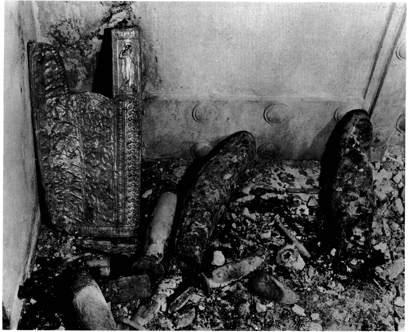 L'ouverture de la porte de communication entre la chambre et le vestibule présentait de trop grands risques pour les fouilleurs. Ils ont donc enlevé, pour s'introduire dans le vestibule, un bloc du mur séparant les deux pièces. A la différence des parois de la chambre, celles du vestibule étaient recouvertes d'un enduit d'une excellente qualité, blanc à la base des murs, rouge dans les parties hautes, avec deux bandeaux surmontés d'un kymation à la naissance de la voûte. Il semble que l'aménagement, voire la construction du vestibule se poursuivirent après la fermeture de la chambre. Contre le mur Sud un sarcophage rectangulaire en pierre (1,01 x 0,56 x 0,68 m) recouvert de débris organiques carbonisés contenait un autre larnax en or (fig. 152) un peu plus petit (0,38 x 0,32 x 0,20 m), moins lourd (8.240 grammes) et moins orné que le premier. Les ossements calcinés qu'il renfermait étaient recouverts par une étoffe exceptionnellement bien conservée dont les motifs (en bordure un méandre, au centre un calice d'où sortent des feuilles d'acanthe et des fleurs environnées d'hirondelles) se détachent en pourpre sur fond d'or. Plusieurs alabastres, une couronne de feuilles de myrte en or, un goryte revêtu de plaques d'or décorées en relief et une paire de cnémides également recouvertes de métal précieux, complètent le mobilier du vestibule (fig. 155). Comme l'a fait remarquer , le goryte a été exécuté à partir du même moule que celui de Karagodeuashkh, dont la restitution pourra être ainsi corrigée (ν. , Scythians and Greeks, p. 221, fig. 125). Les deux cnémides sont légèrement dissemblables, celle de gauche est plus courte de 3,50 cm et de forme légèrement différente.