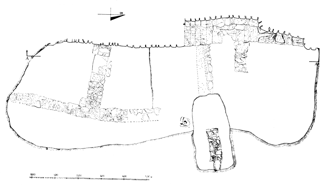 La deuxième pièce du bâtiment situé derrière la tour Β a été complètement dégagée (fig. 194). On y a recueilli de nouveaux tessons géométriques et un amoncellement de plus de cent vingt patelles. La couche sous-jacente contenait exclusivement de la céramique HR III B. Une cavité naturelle du rocher revêtue de plaques de schiste constituait un foyer (0,70 x 0,50 m ; profondeur : 0,40 m) près duquel on a retrouvé un ustensile de cuisine fragmentaire, des petits os et des patelles. Contre le mur de séparation, une structure en pierre (1,40 x 0,80 m ; hauteur : 0,40 m) doit peut-être être interprétée comme un lit. Une portion du dallage du sol est conservée contre le mur Sud.