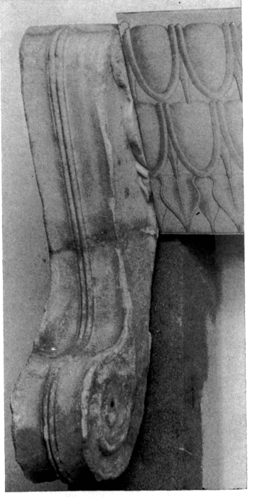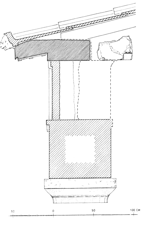 2) Temple B. La console de porte restaurée en 1976 était pourvue de moulures latérales qui ont pu être reconstituées graphiquement (fig. 201). Observation plus intéressante, le temple possédait un adyton qui témoigne d'un culte chthonien ou à mystères. Or la tradition rapporte l'existence, à l'intérieur de la ville, d'un tel culte en l'honneur de Corè (ν. ΑΜ 26 [1901], p. 213-214). Ce monumental temple archaïque qui, d'après la dispersion des fragments, devait se trouver sur l'acropole, a donc toute chance d'être un temple de Corè — à distinguer du Thesmophorion sis hors les murs.