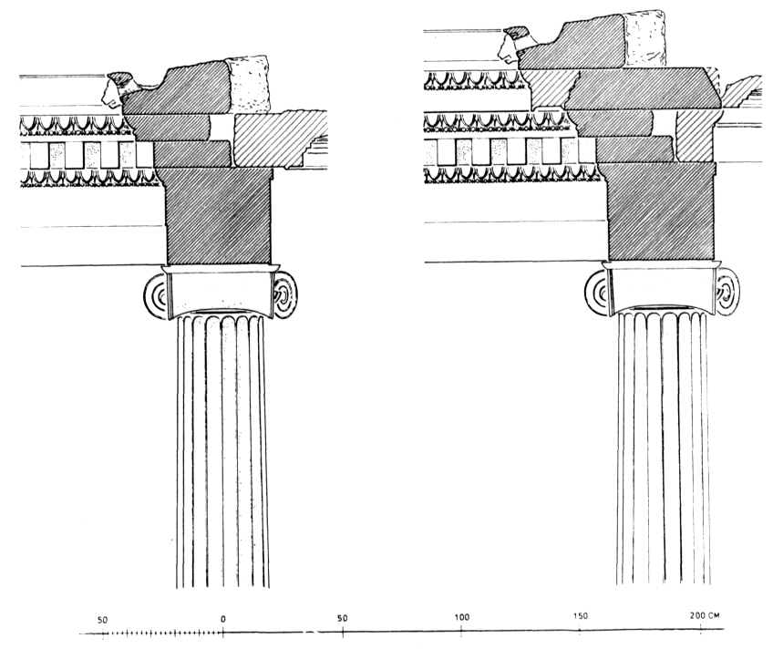5) Les éléments d'un ordre ionique trouvés en 1976 ont été étudiés : trois colonnes à dix-huit cannelures, un chapiteau d'angle qui reproduit visiblement celui de Bassae, neuf blocs d'architrave dont deux correspondent à un angle interne, des denticules avec un astragale et un kymation ionique, enfin une sima dont le lit de pose porte les traces dudit kymation. Il ne peut guère s'agir que d'une cour péristyle hypètre (fig. 200 a). Le seul bloc de corniche, dont la partie débordante a malheureusement été retravaillée à l'époque byzantine, mesure 3,70 m de long — soit exactement deux entrecolonnements — et seulement 0,17 m de haut (fig. 200 b). Il devait être employé comme poutre de décharge au-dessus d'un double entrecolonnement qui, selon toute apparence, dégageait l'ouverture d'une abside inscrite de 3,86 m de diamètre au fond du péristyle : on a retrouvé deux blocs de cette niche semi-circulaire qui devait abriter une statue cultuelle. La similitude de la technique et du diamètre invitent à rapprocher de cet ensemble l'édifice rond reconstitué en 1972 par H. Fastje, et qui devait se trouver dans la cour, en face de l'abside cultuelle. Un autel de 3,30 m de large qui présente les mêmes crampons, la même technique de taille et des antes richement décorées, doit également appartenir à ce complexe dont l'interprétation est suggérée par plusieurs indices. Une liste de comptes publics est inscrite dans l'encadrement de la porte de l'édifice rond. Or une inscription inédite découverte par le Service archéologique précise que les archives de la ville, de même que les stèles inscrites, sont déposées dans le sanctuaire d'Hestia. On sait par ailleurs qu'Hestia était honorée dans le Prytanée, centre administratif de la cité. L'édifice doit donc être interprété comme le foyer sacré ; les annexes du Prytanée (cuisines, salles de banquets, archives) devaient se répartir autour de la cour péristyle. L'emplacement du Prytanée lui-même doit être cherché sur l'agora.