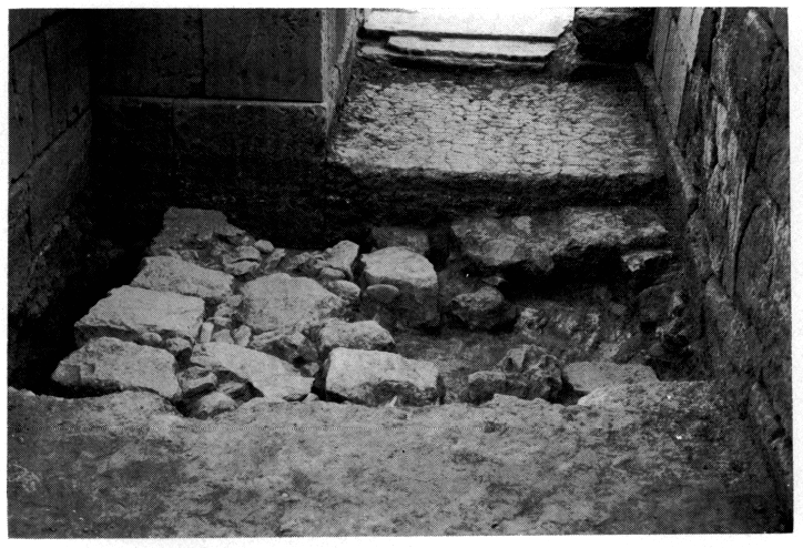 En 1977 a poursuivi, sous les auspices de l'École italienne, le dégagement du four découvert l'année précédente à l'Est du bastion mycénien et a étendu la fouille du quartier prépalatial, découvrant un vaste bâtiment absidal. De son côté , de l'Université de Catane, a dirigé une première campagne de fouilles dont l'objectif était d'observer la séquence stratigraphique sous la villa et de préciser la datation de l'agora. A cette fin quatre sondages ont été exécutés. Dans le sondage I, ouvert sur toute la largeur du couloir 74, on a rencontré un sol de plâtre et de cailloutis, et, au-dessous, un mur orienté Nord/Sud (fig. 256). Le matériel associé n'est pas postérieur au début de l'époque des seconds palais, ce qui confirme la chronologie proposée jadis par pour l'ensemble de la villa. Dans le sondage IV, à l'Est du précédent, est apparu le sol rouge stuqué et peint, connu par la fouille de 1912. Une dalle de gypse alabastrin se trouvait au même niveau. L'absence de tout matériel significatif empêche de dater précisément ce sol, mais il appartient sans doute à une construction de l'époque des premiers palais. En effet, sous l'esplanade 10, le sondage II a mis en évidence des murs de cette époque associés à un sol stuqué. D'autre part l'étude du matériel recueilli par en 1958 sous le petit temple atteste une occupation ininterrompue des lieux pendant toute la période des premiers palais. Le sondage III, pratiqué contre le mur de fond des pièces qui s'ouvrent sur l'agora, a atteint la profondeur de 5 m et traversé sept couches principales. Il a surtout permis d'assigner avec certitude la construction de la stoa au Mycénien III A 2 (ou peut-être A 1). Cette stoa, vraisemblablement en ruine dès le Mycénien III B, devait s'inscrire dans un plan d'urbanisme que les campagnes futures s'efforceront de préciser.