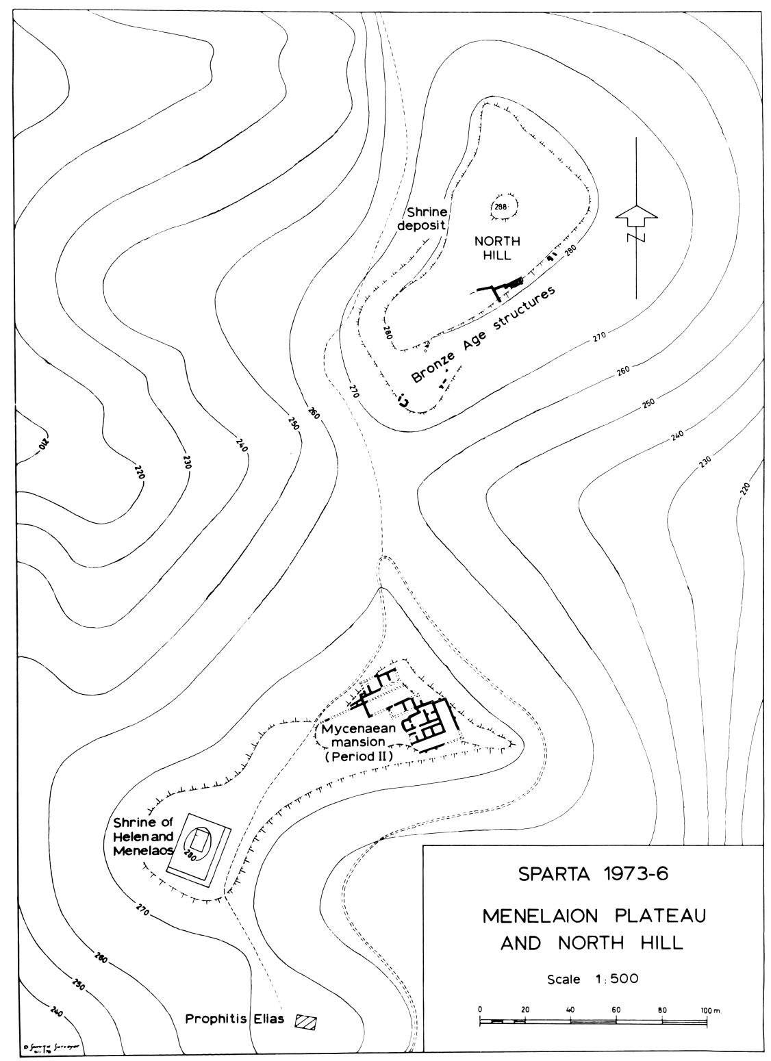 La colline du Ménélaion, déjà passablement explorée, a fait l'objet de travaux mineurs : dans le mégaron du bâtiment I (voir le plan publié dans le BCH 99 [1975], p. 622) dégagement du seuil séparant le porche du vestibule et nettoyage de l'angle Sud-Est du vestibule lui-même ; à l'Est des bâtiments, petit sondage dans les dépôts de céramique HR III B, perturbés par une fosse qui contenait du matériel archaïque et classique, premier exemple de remaniement aussi récent dans cette zone.