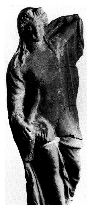 La même séquence s'observe encore au Nord-Est, dans un bâtiment en pôros qui a toutes chances, lui, d'être un sanctuaire de divinité féminine. Il se compose de deux pièces principales auxquelles une troisième fut ajoutée ultérieurement. L'une d'elles abritait deux foyers circulaires et une banquette en pierre. A l'extérieur un dépôt contenait des vases et des figurines représentant Aphrodite (fig. 230), Athéna, Gybèle, Léda et le cygne. La plupart datent de la fin du IVe s., mais certaines remontent au début du Ve, voire à la fin du VIe s. av. J.-C. ArchDelt 27 (1972) Chron., p. 530-533.