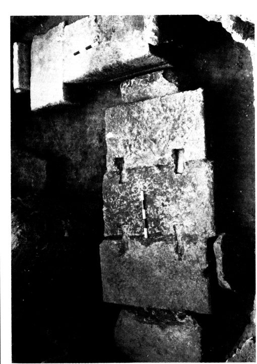 « A l'extrémité Est du sarcophage n° 1, on avait ménagé un enclos d'environ 0,75 m de côté, délimité par deux chapiteaux et une dalle disposée de chant. Cette petite enceinte cultuelle contenait cinq lagynoi et des ossements d'animaux. Le sarcophage lui-même, qui avait été violé dès l'antiquité, contenait encore un grand nombre de lacrimatoires, quelques monnaies de bronze très corrodées et des fragments d'objets de bronze.