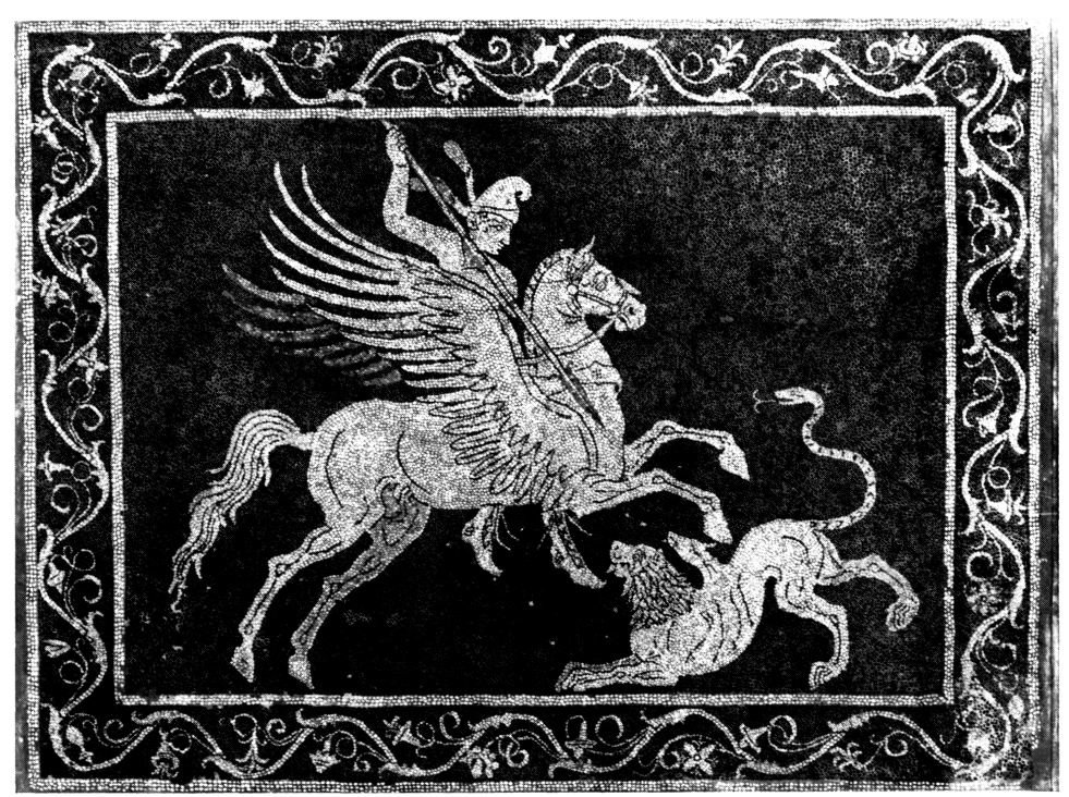 On retiendra surtout la fouille exécutée en 1976 par aux frais de la Société archéologique. Elle a permis de dégager à l'angle des rues P 19 et P 23 a, quatre nouvelles pièces d'une maison découverte dix ans plus tôt dans le terrain voisin (v. ArchDelt 22 [1967], Chron., p. 523-529). Une mosaïque en petits galets noirs et blancs, qui représente Bellérophon et la Chimère (fig. 301), tapisse le sol de la pièce d'angle. Elle appartient, comme la mosaïque du Centaure découverte naguère dans l'une des pièces voisines, à la deuxième phase architecturale de la maison (fin du IVe-début du IIIe s. av. J.-C.). Sur un panneau secondaire, qui unit le tapis central au seuil de la pièce, est représentée une sphinge. Ergon (1976), p. 166-171.