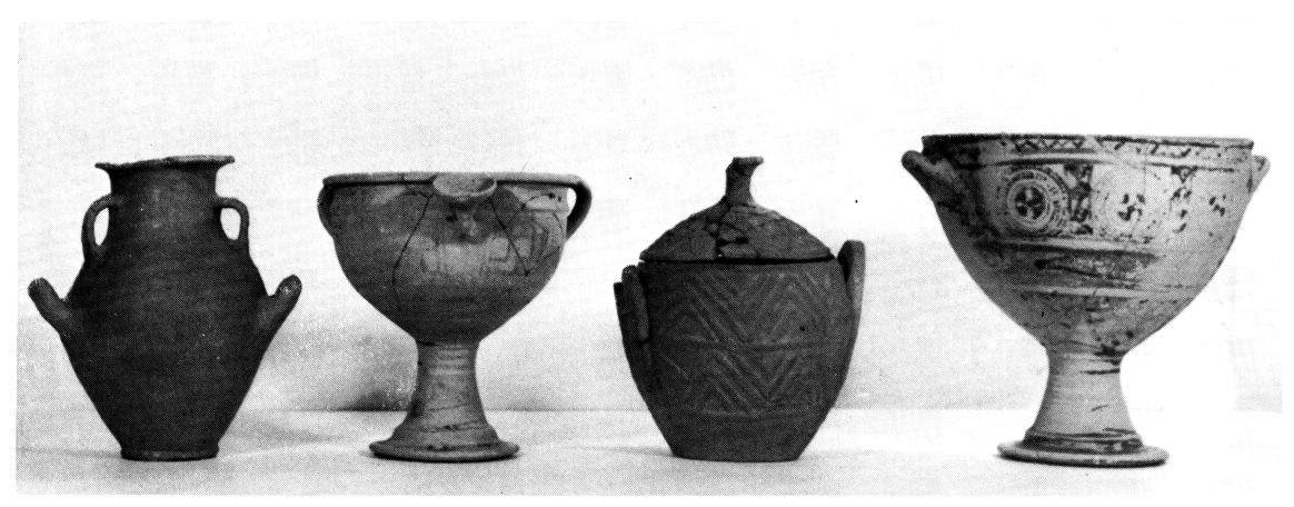 Avant de poursuivre l'exploration systématique des lieux, donne un premier aperçu du riche matériel trouvé en 1974 dans une tombe géométrique de Vati, au Sud de Rhodes. Au fond de la tombe les fouilleurs ont recueilli, parmi les cendres et les ossements calcinés, neuf vases et quelques fragments de petits objets en or, en bronze et en fer. La couche supérieure contenait un grand vase cinéraire (?) sans décor et trente-cinq autres vases déposés en offrande (fig. 302). Ceux-ci, marqués à la fois par l'influence chypriote et la persistance des traditions protogéométriques, ont tous leur parallèle parmi la céramique rhodienne du VIIIe s. av. J.-C. ArchAnAth 8 (1975), p. 223-226.