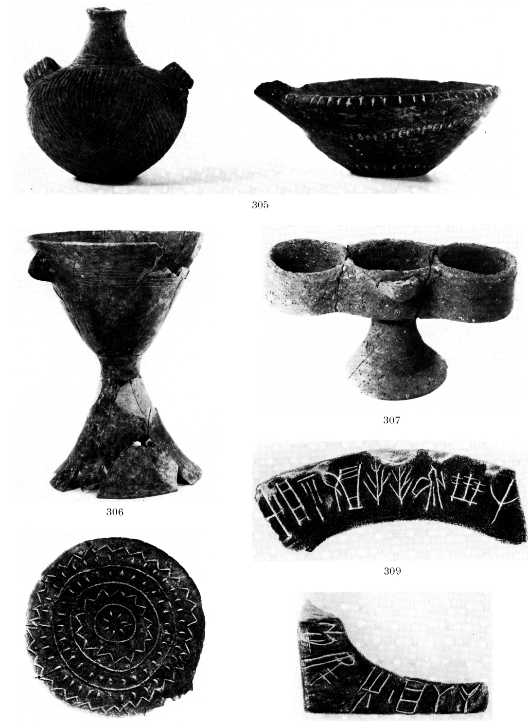 En 1971 le Service archéologique a exploré, près de Sitia, deux cent cinquante-deux tombes MA qui constituent la plus vaste nécropole minoenne connue. Les tombes, creusées dans la roche tendre, se composent pour la plupart d'une antichambre à ciel ouvert, ancêtre du dromos, et d'une chambre assez petite de forme ellipsoïdale. Parmi leur riche mobilier elles comptaient presque toutes un vase brisé— le plus souvent une coupe du style de Pyrgos (fig. 306) — vraisemblablement destiné à une ultime libation. On a recueilli en tout mille huit cent vases MA I-II de types très divers (par exemple fig. 305-308), une série d'objets en bronze (hameçons, poignards), des amulettes zoomorphes en plomb et des outils en pierre polie. Seules quelques tombes à fosse qui abritaient, semble-t-il, des sépultures d'enfants, étaient pauvrement dotées. ArchDelt 27 (1972) Chron., p. 648-650.