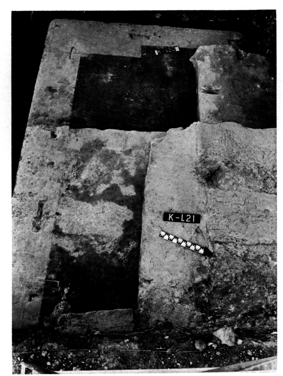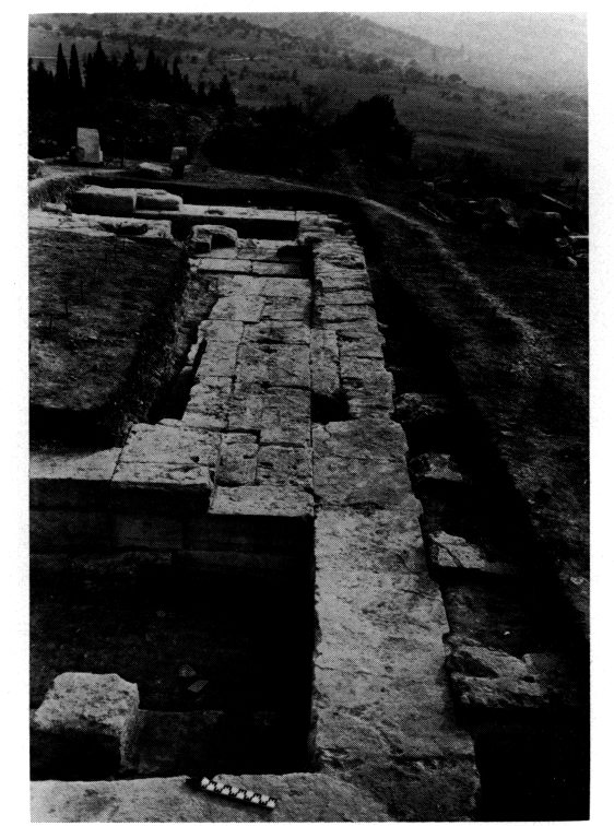 En 1975, on a continué le dégagement des fondations du temple classique (fig. 133 ; v. plan dans BCH 99 [1975], p. 636-637), en particulier celles de l'angle SO (fig. 134), ce qui confirme la longueur supposée de l'édifice, 45,80 m, et on a trouvé, dans la cella, les fondations de la colonnade interne et celles de la base de la statue de culte. On a également mis au jour les vestiges d'un édifice antérieur (±550), de dimensions voisines, détruit, au début du Ve siècle et partiellement remployé dans la construction classique.