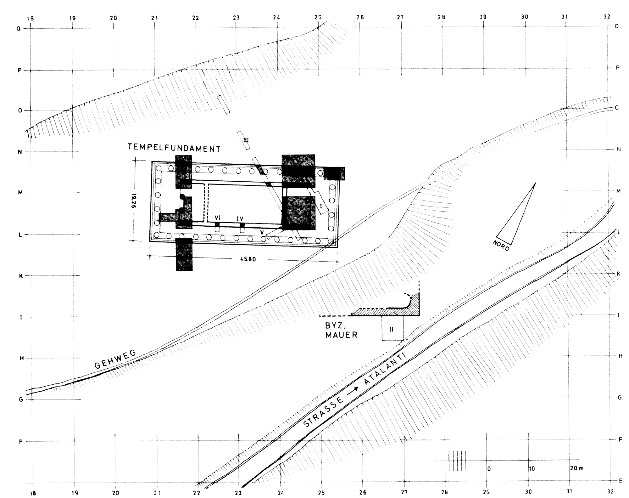On a pu relever le plan du temple (fig. 97) : les fondations mesurent ±19,26x45,80 m, le stylobate doit avoisiner 17,68x44,20 m. Les proportions sont 2/5. Le péristyle comporte 6x14 colonnes, mais on ne peut déterminer s'il y avait des travées inégales sur le long et le petit côté. Le temple, dont les fondations sont de pôros tendre et l'élévation de calcaire gris, a été considérablement pillé ; il ne subsiste, du côté de l'opisthodome, que le toichobate qui présente des traces d'antes et de colonnes in antis (fig. 98) et l'assise inférieure de la krépis : manquent le degré intermédiaire et le stylobate.