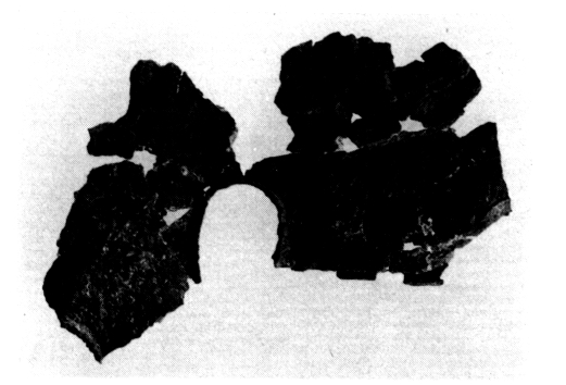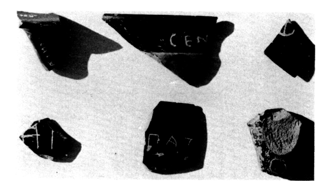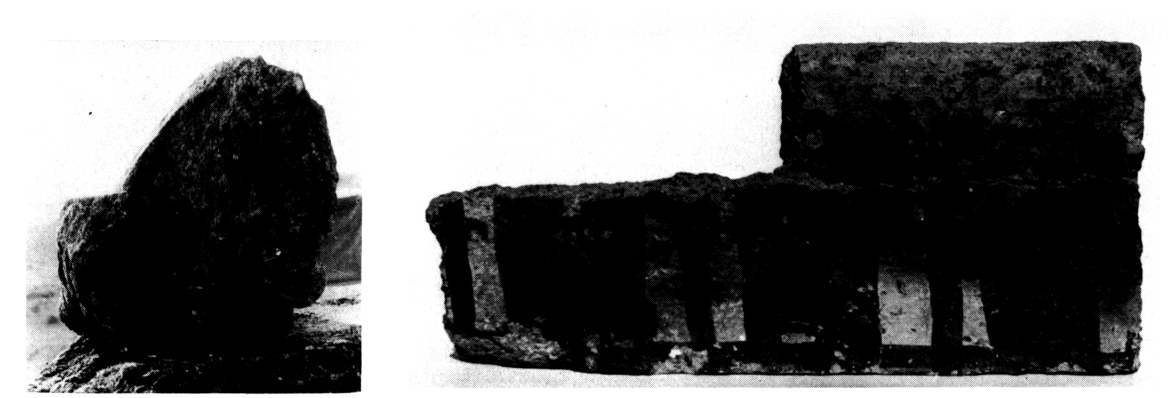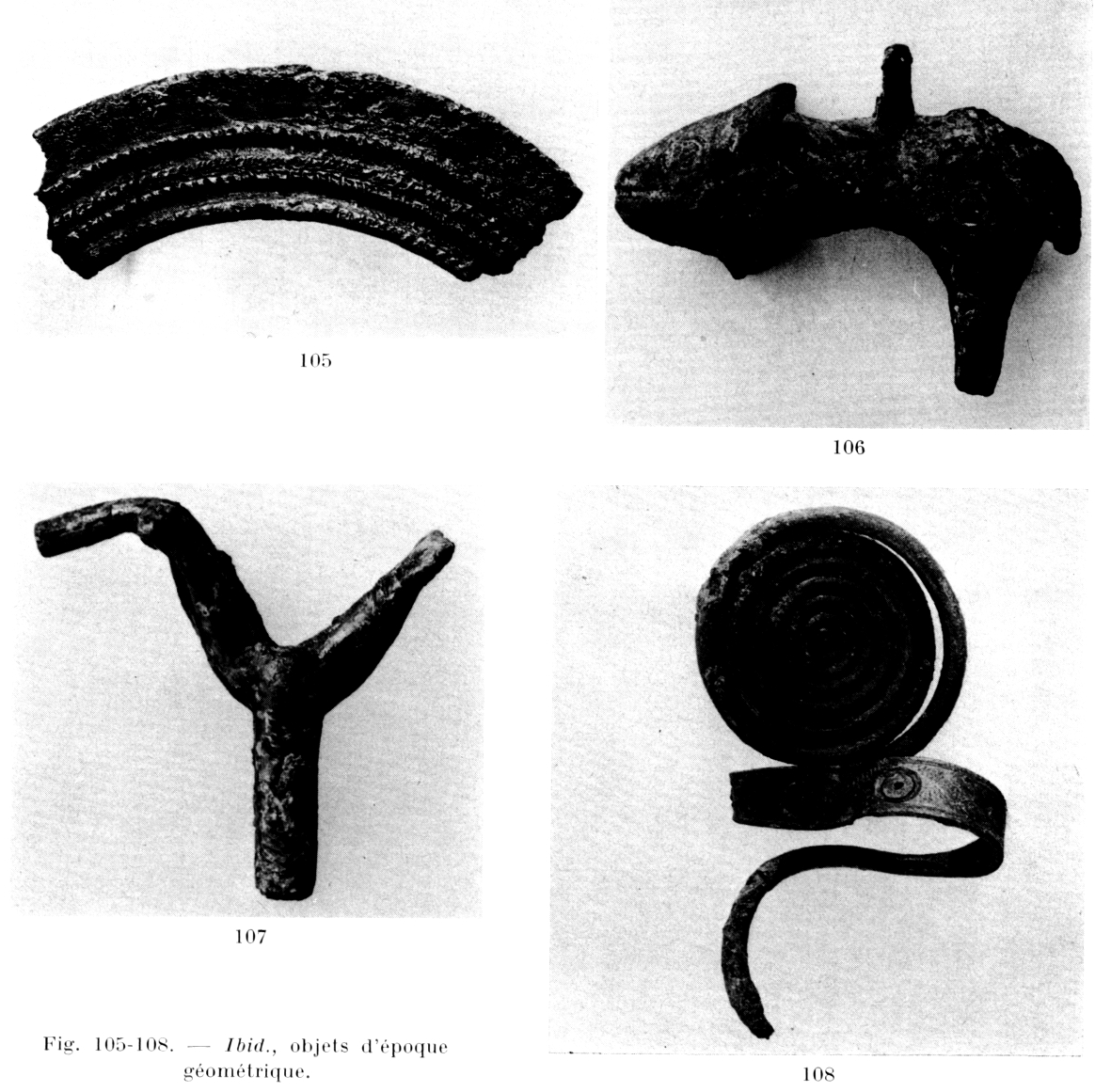 Des époques classique et archaïque on n'a recueilli que quelques objets votifs : fragments de casque (fig. 103), d'armure, d'armes de fer, et des tessons inscrits (fig. 104) qui ne livrent malheureusement pas d'indice pour l'identification de la divinité. Les offrandes de l'époque géométrique, trouvées pour la plupart en surface sur la terrasse en contrebas du temple (fragments de poignée de trépied de bronze — fig. 105 — , statuettes votives, dont le lion de la fig. 106 et l'objet en forme d'oiseau de la fig. 107, bijoux de bronze — fig. 108 — et armes de fer) et surtout la céramique recueillie (protogéométrique, submycénienne, mycénienne tardive), montrent clairement que le sanctuaire est resté en activité sans interruption du HR III B jusqu'à l'époque classique.
