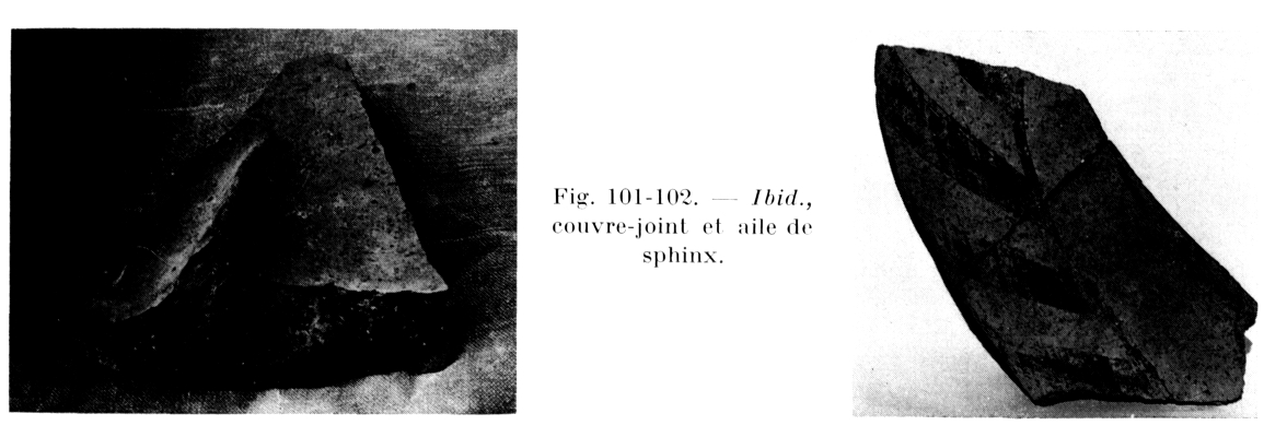 Ce temple classique, le dernier du sanctuaire, fut précédé par un édifice archaïque et par un édifice du VIIe siècle, comme en témoignent les fragments de sima rampante (fig. 100) et de couvre-joints du type de ceux que l'on trouve au sanctuaire de l'Isthme (fig. 101) ; en proviendrait aussi un sphinx de terre cuite (genou et aile ; fig. 102) qui trouve un proche parallèle dans le thymiatérion du Céramique. Ce serait l'acrotère figuré le plus ancien.