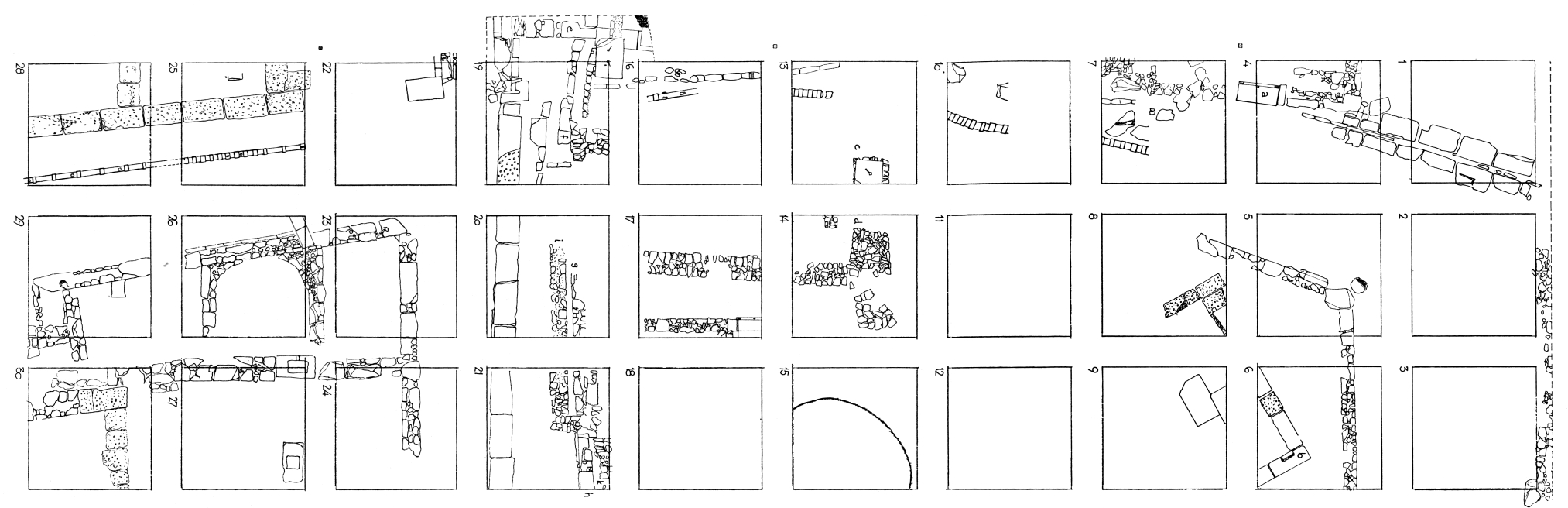 Alors que la partie S de la zone fouillée n'a révélé aucune construction romaine, les restes d'un bâtiment romain ont été retrouvés au Ν de la première rue transversale E-O (14, 17, 20, 21). En outre, le monument érigé sur la rue, à la hauteur de ce bâtiment, est du type de ceux placés aux intersections des rues romaines ; deux de ses fondations carrées sont conservées (13, 14), l'une portant encore une base classique réutilisée (13). Enfin, il convient d'associer le grand bassin en morceaux de terre cuite, plus à l'Ε (15), sorte de pressoir, avec l'hypothèse concernant la présence d'une ferme romaine en F/5.