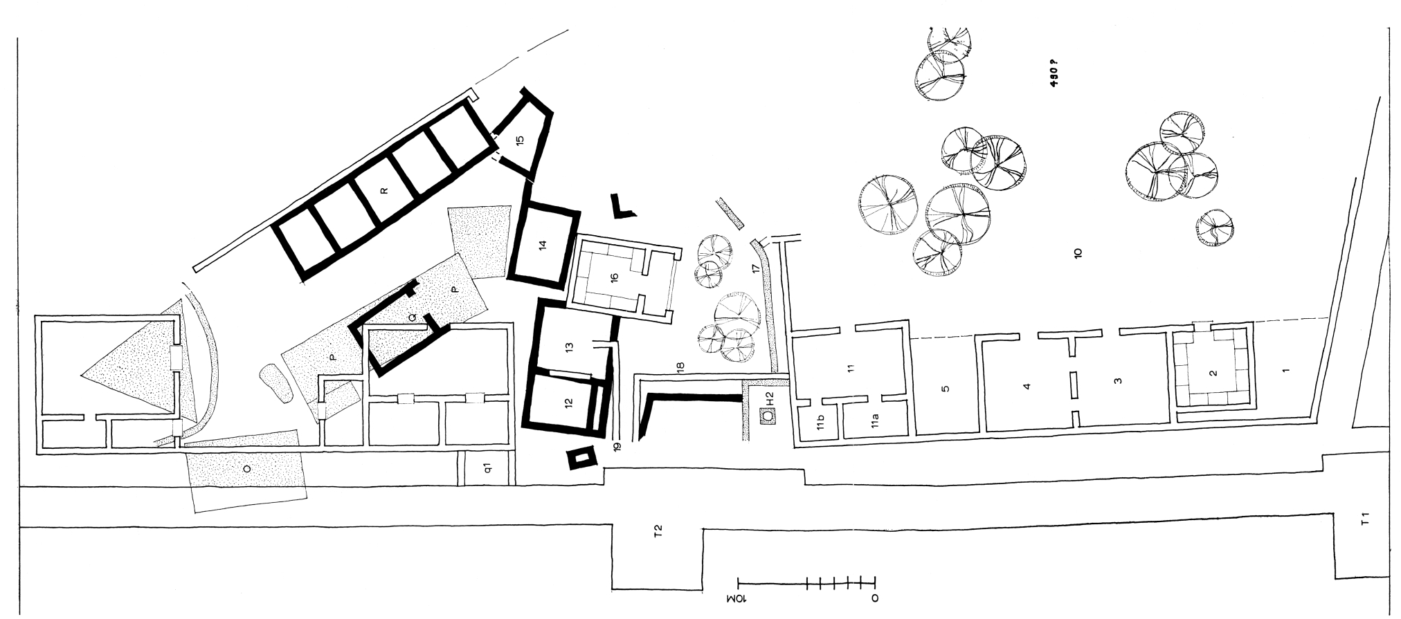 b. Oikos Q et bâtiment R : fin de l'époque archaïque ou après 490 ? On avait estimé que le second déplacement, reconnu par Claude Bérard, résulte de la construction des fortifications à l'Ο ; l'oikos Ο fut remplacé par Q et le bâtiment à cinq chambres Ρ par R. Q et R sont datés vers 550 d'après la céramique. Or, dans le Führer durch Eretria, l'on s'était prudemment demandé si cet ensemble n'avait pas été reconstruit après 490 ; on peut même se demander aujourd'hui s'il ne date pas tout simplement de cette époque. Quatre arguments sont en faveur d'une telle hypothèse : une destruction violente peut fournir l'occasion d'une reconstruction totale ; le système des canalisations post 490 affecte la même orientation que le puits à l'Ο de 12 ; les pièces 12-15 sont liées à R, d'une part, et à l'oikos 16, d'autre part, qui date certainement de la fin du Ve siècle ; enfin, il est surprenant que la pièce 17 ménage, au N, l'annexe trapézoïdale de P. Les édifices construits après le second déplacement sont dessinés en noir sur la fig. 272.