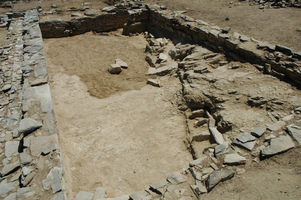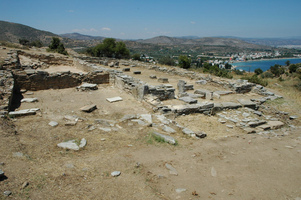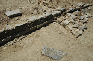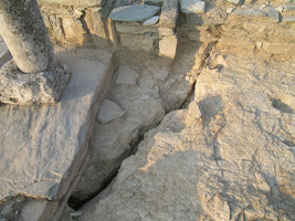 - À l’intérieur du temple à rangée centrale de piliers (fig. 1) on a poursuivi le nettoyage du sol dans les parties orientale et centrale de la cella, mettant au jour plusieurs cavités creusées dans rocher, qui pourraient être liées à une phase plus ancienne (hypèthre ?) du sanctuaire. Dans l’angle Sud-Est de la cella on a repéré un canal d’écoulement pour les libations (fig. 2) qui se poursuit sous le seuil de la porte d’entrée ; il aboutissait probablement dans la grande cavité – repérée en 2004 dans le vestibule – qui renfermait des coquillages. Ce canal est analogue à celui qui se trouve dans l’« Oikos des Naxiens » à Délos. Dans l’angle Nord-Est de la cella on a trouvé plusieurs fragments de l’amphore panathénaïque qui avait été découverte lors des fouilles allemandes de 1973 dans le vestibule et qui est exposée au musée archéologique de Volo.