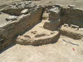 - Dans la pièce D, l’une des deux pièces accolées au mur Sud du monument (fig. 3), on a recoupé la couche de destruction renfermant des pierres et des tuiles laconiennes, dont certaines portent un décor en relief (palmette ou cavalier). Au-dessous de cette couche se trouvait une épaisse couche de remblai provenant du nivellement étendu qui a sans doute précédé la construction de la pièce. Ce remblai a livré de nombreux vases fragmentaires, notamment des vases de stockage, des vases miniatures, des fragments de figurines féminines en terre cuite, ainsi que plusieurs bijoux et autres petits objets en bronze. Bien que l’étude de ce mobilier soit en cours, sa datation doit s’échelonner entre la fin de l’époque archaïque et celle de l’époque classique. Presque au centre de la pièce, autour d’une construction sommaire de gros moellons, on a repéré une concentration d’objets, parmi lesquels des figurines féminines assises d’époque archaïque et une phiale intacte. En biais, le long de la limite Sud de la pièce et contre le rocher naturel, se trouvait une construction allongée, sans doute une banquette. À l’extrémité Est de celle-ci une autre construction semi-circulaire était faite de dalles posées de chant (fig. 4). On suppose que toutes ces constructions appartiennent à une phase antérieure (hypèthre ?) du sanctuaire. Plus tard l’espace fut en partie remblayé avec des terres et du mobilier provenant de l’intérieur du temple et de ses abords ; c’est peut-être à la même époque que l’on rassembla les pièces de sculpture et les bases inscrites dans le vestibule et que l’accès au temple se fit par une porte au centre du mur Nord.