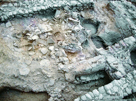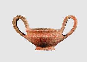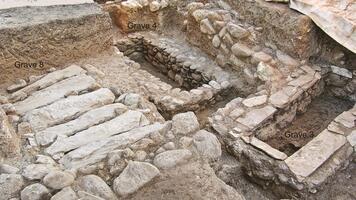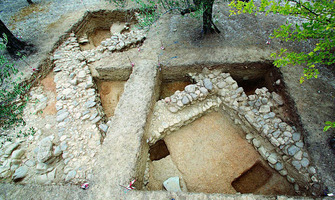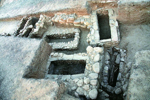 Just to the north of building A was an MH III - LH I cist tomb cemetery (Figs 11,12). Ten tombs were found at different depths and with different orientations (east-west and north-south). Several had large cover slabs while others were uncovered: they were used for one to three burials. Similar but appreciably smaller tombs were used for child burials. Goods consisted of a few pottery vessels. One child burial held an LH I cup, and another an askos and a kantharos (Fig. 13).