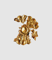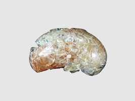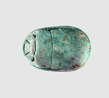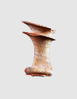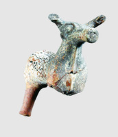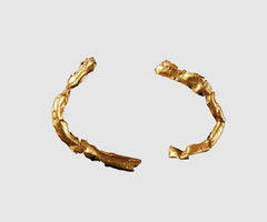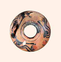 In sector I lay building A, with a mud brick superstructure, which had been destroyed by fire. Seven rooms were identified (Fig. 2), one of which contained a large quantity of arms and armour (16 bronze swords, a dagger, a knife, spearheads, a bronze helmet and the remains of a boar’s tusk helmet: Fig. 3) the position of which implies that they were placed in a chest. In a neighbouring room, objects found below the collapsed roof include the neck of a stone vessel (Fig. 4), a bull-shaped rhyton (Fig. 5) inlay from the upper part of a sword handle (Fig. 6), an Egyptian scarab (Fig. 7), and gold sheet ornaments (Figs 8-10). Associated pottery (including almost intact vessels) dates the complex to MH III – LHI/IIA.