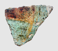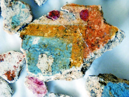 Building B: within the building (Fig. 14) was a quantity of fragments of wallpaintings, including depictions of human figures as well as ornament. Depictions include a lower leg clad in a greave on a blue background (Fig. 15), a female head set within a banded border (Fig. 16), and part of a chariot wheel (Fig. 17).
