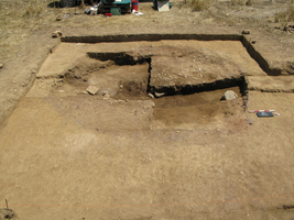 Par ailleurs, la fouille du bâtiment ovale semi-enterré à l’extrémité Nord du site s’est poursuivie et a permis de mettre au jour le plan de la structure (fig. 1). Un sondage à l’intérieur de l’édifice a révélé un dépôt de vases qui suggère une succession de sols en terre compactée et des traces d’érosion : cela indique des cycles de réoccupation de cette partie importante du site. Les vestiges d’enduit d'argile sur des dépôts verticaux de cendres le long du mur indiquent probablement la présence d’une structure légère en bois destinée à couvrir la grande fosse creusée dans la roche.