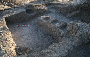 Dans la partie Nord-Ouest du site, le sondage E a été élargi : il est apparu que les murs chypro-classiques taillés dans le rocher et les sols découverts lors de la campagne de 2010 appartiennent à une pièce semi-enterrée reliée à une deuxième pièce à l’Est de cette dernière par un couloir en pente d’une largeur de 0,60 m (fig. 1). Une troisième pièce semi-enterrée a été fouillée au Sud : elle est constituée d’une structure circulaire en petites pierres construite directement sur le sol rocheux de la pièce. Les recherches ont révélé d’autres structures creusées dans la roche : une niche circulaire, des trous de poteaux et une série de cavités rectangulaires ménagées dans l’une des cloisons taillées dans la roche entre deux pièces.