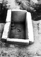 Tomb I contained one skeleton, further bones perhaps from a transferred burial, a West Slope askos of guttus type, and a few sherds (fig. 1). Tomb 2 contained the skeleton of a youth, a Corinthian-type skyphos, a handleless skyphos and a small oinochoe, a bronze kantharos, an iron strigil, seven or eight egg-shells, and at least 140 knuckle-bones (figs 2-3). The assemblage dates to the third quarter of the fourth century.