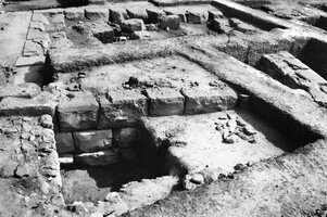 The tower walls, of well-worked sandstone blocks, were preserved to a height of 1.4m, with at least one further course implied by cuttings in the upper faces. The tower had two internal spaces divided at foundation level by a wall: there was red plaster on the interior walls. In front of the entrance (in the northwest corner) was a pebble floor which was not contemporary with the initial construction. South of the tower was a large square courtyard (15 x 17m), which did not communicate directly with the tower: a small area of its pebble paving was preserved. In the south part of the courtyard were the remains of workshops in use during the final phase of the settlement. Two long shallow cisterns were used for the preparation of potter’s clay (shaped masses of clay were found nearby). On the west and south sides of the court was a stoa with five column bases (two of which were found collapsed on the final destruction level). The columns and many other limestone spolia (column capitals, half columns, parts of the epistyle, and building blocks) derived from a major earlier building, probably a temple, somewhere in the area. Little is known about the rooms surrounding the courtyard: in the final phase, building extensions around the court and in other open spaces in the settlement improved the available space. A large number of storage pithoi, mostly for grain and olives, were scattered across the settlement during this phase.