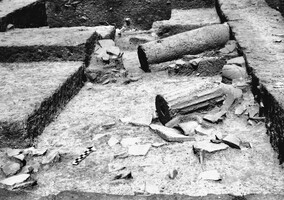 In the remaining area of the settlement, around the central residence, evidence was more fragmentary. The remains of at least four further buildings were found, plus sections of wall from many others, all on the same orientation. A large dump (ca. 15 x 13m) on the west edge of the excavation area was probably created following extensive cleaning of the settlement. It contained stones, tile, plaster, pieces of flooring, numerous loomweights, and a large quantity of small finds many of which are lead (clamps, weights, buttons etc.). This deposit covered a round kiln of which only the foundation survives.