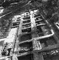 Room 1 contained an individual orthogonal bath-tub heated from the hypocaust (the round pillars of which are preserved) and fed from the south side. Room 2 contained two such tubs similarly heated. The walls of both rooms were heated via tegulae mammatae preserved in situ. A corridor linked rooms 2 and 8 to the east: beneath its floor was a lead sheet. Room 2 also opened into room 3 (the praefurnium), although this opening could be blocked by bricks. Debris from the furnace was scattered in this area. The furnace had two mouths which had been extended to improve its efficiency. The function of room 4 is unclear, although its location suggests a tepidarium. The round room 5 had thick plaster on the walls, suggesting that it was used for bathing: the entrance was on the south side. It was later refashioned with the construction of a small orthogonal potter’s kiln, with an eschara resting on an X-shaped support and a stomion opening to the south. After the kiln fell into disuse, a tomb was cut into the north part of the eschara. The large room 6 preserved the pebble and plaster under-lay of a fine plaster floor: the original use cannot be restored (the room was remodelled in the Early Christian period). At least three built structures (benches or steps) were set against the east wall.