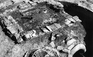 Four cisterns were found in the west of the excavated part of the bath. One had a low step around it, a terracotta paved floor, and part of the torso of a small marble male statue which was probably originally set in a niche in a wall. A large wall in opus mixtum which bounded the greater part of the building on the east side was a Late Roman or Early Christian addition: pithoi were built into it in certain places. Parallel to it was a wall of unworked stone, with similar cross-walls defining rooms or spaces of uncertain function.