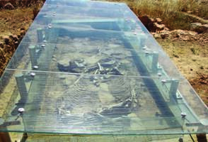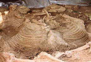 Dendra. E. Pappi (Δ’ ΕΠΚΑ) reports the discovery of a horse burial (Figs 1-2) in the north part of the Mycenaean cemetery, close to the tombs excavated by E. Protonotariou-Deikali in 1977 and to chamber tombs 2, 15 and 16. A pair of horses (5-6) were found to the east of the pair (1-2) excavated in 1977. They had been placed directly onto bedrock, set face to face, and oriented east-west. Sherds found by their legs include a very few plain kylix stems. In addition, a concentration of bones from three or four horses, found to the west of pair (3-4) excavated in 1977, must have been displaced from a tomb. The new total of three pairs of horses and three or four displaced individuals highlights the significance and duration of this funerary practice. The location of the burials outside the chamber tombs makes it likely that this was a collective practice, over and above any association with a particular chamber tomb. The burials of two pairs, (1-2 and 5-6) have been roofed as an open air display.