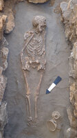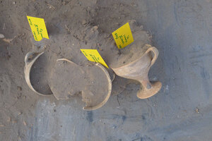 Vaskina (Socha). A. Karapanagiotou (Director, ΛΘ’ ΕΠΚΑ) reports the exposure of a previously unknown Mycenaean cemetery 10km northwest of Leonidio following heavy rain. Five cist tombs were excavated, all containing multiple burials (fig. 1). Grave goods, which include drinking vessels (fig. 2), stone spindle whorls and a bronze pin, date to the 14th century BC. Sherds scattered in the area may indicate Mycenaean settlement. The site is close to Kotroni, where two Mycenaean tholos tombs were excavated in 1936 and 1938.