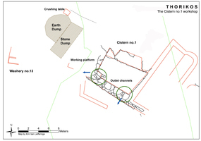 This cistern provided water for silver processing (Fig. 2) and formed part of a larger metallurgy workshop (as indicated by a newly discovered washery, a stone table for crushing ores, fragments of grinding stones and a nearby mine entrance [2]). The newly discovered ore washery (13) lies ca. 16m west of the cistern and in line with its most westerly overflow channel. Only one of its settling tanks is visible on the surface.
