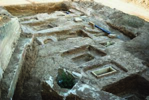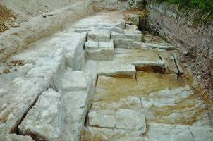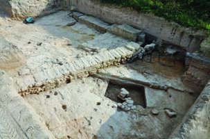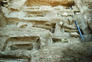 West of the quarry, excavation for a bridge revealed an Archaic cemetery (figs 4-5). Thirty tombs were excavated, four of which were child burials: nine larnax burials, seven cist graves, 12 pits with limestone cove slabs, and two pits without covers. Twenty-four graves were oriented south-north, five east-west, and one had been moved and its original orientation could not be determined. On the north side of this plot lay tomb 71 of the ΕΡΓΟΣΕ excavations, confirming that the entire ca. 50m-deep area between the road and the new high-speed railway line has been investigated.