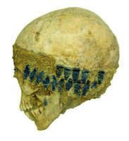 On the cranium of one woman buried in a pit was preserved a diadem of three rows of blue glass-paste relief beads or plaques.