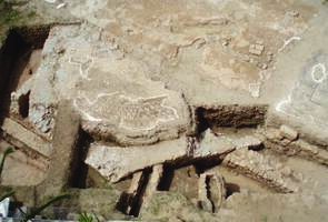 Finds from the excavation include Roman and Late Roman pottery, metal items, marble and other stone members, glass vessels, glass paste tesserae and masses of glass, painted plaster, and seven bronze coins.