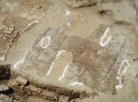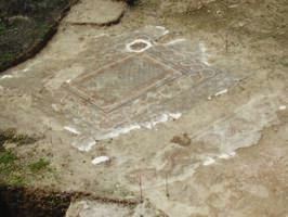 The mosaic extens into the neighbouring Koutsogiannopoulou property to the west. It is decorated in sections according to the plan of the basilica.