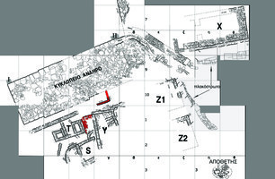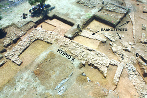 At the east of the terrace was a partially preserved but carefully laid paved courtyard or square (Fig. 3). Two channels drained rainwater from this court. East of the terrace, excavation of the large, partially preserved Building X (14.6 x 7m) continued. The excavator hypothetically reconstructs a plan comprising a sekos and prodomos. Modifications and additions to the building were made from time to time, but apart from LH IIIA2/B sherds on the south side, no finds were made in the interior. Outside the southeast corner, a plain, undecorated stele, in situ on its base, was probably a boundary marker.