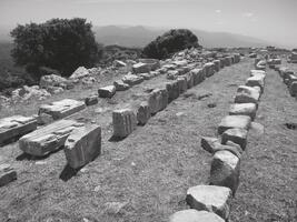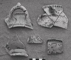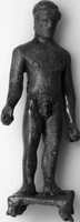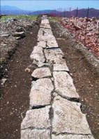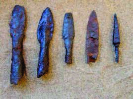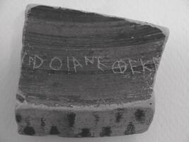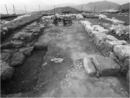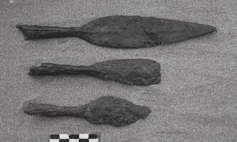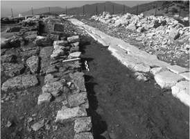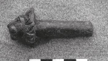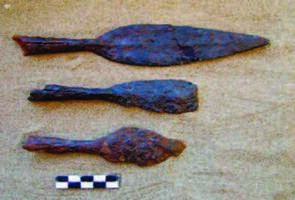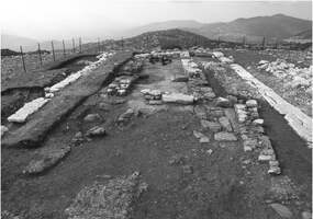 Ano Melpeia, Petroula. X. Arapogianni (former Director, ΛH’ ΕΠΚΑ) reports on excavation following the discovery of a large quantity of architectural spolia during the demolition of the modern church of Prophitis Ilias (fig. 1). The foundations of a late sixth- or early fifth-century BC temple were revealed (fig. 2), with maximum preserved dimensions of 20.65x10.75m (the full length is calculated at 23m). A small foundation within the building probably belongs to the first, Archaic, temple of the late sixth-century. In addition to pottery (plus miniature vessels), finds include a bronze bracelet with snake-head finials, a bronze figurine of a naked warrior carring a spear, a bronze rod terminating in a lion’s head, a small bronze vessel, bronze sheet with a relief depiction of a procession of women carrying branches, iron nails, a large quantity of iron spearheads (figs 3-4) and a sherd with a dedicatory graffito ΑΝΕΘΕΚΕΝ.
